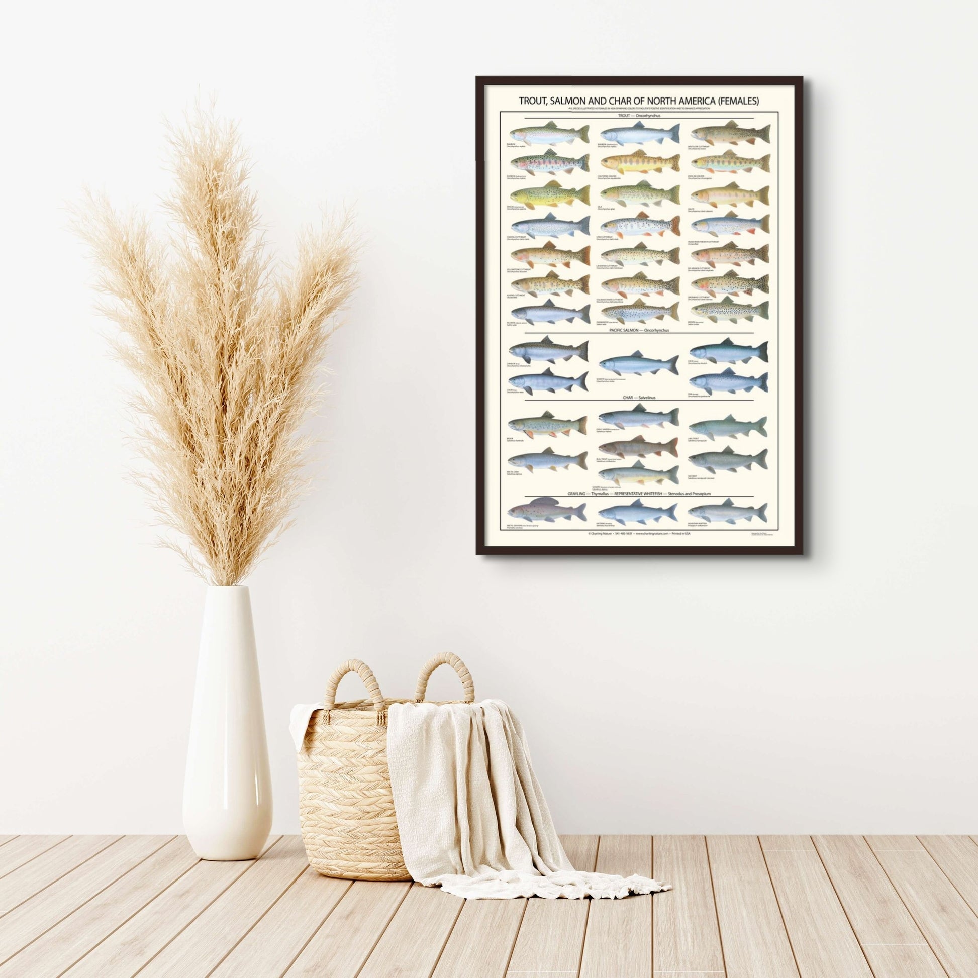 If you are a fishing enthusiast, then you'll love this Trout Salmon and Char Poster and Identification chart! This is not just a poster, but a great wall art print that adds an aesthetic appeal to any fishing cabin or room. The stunning design showcases different species of trout, salmon, and char.