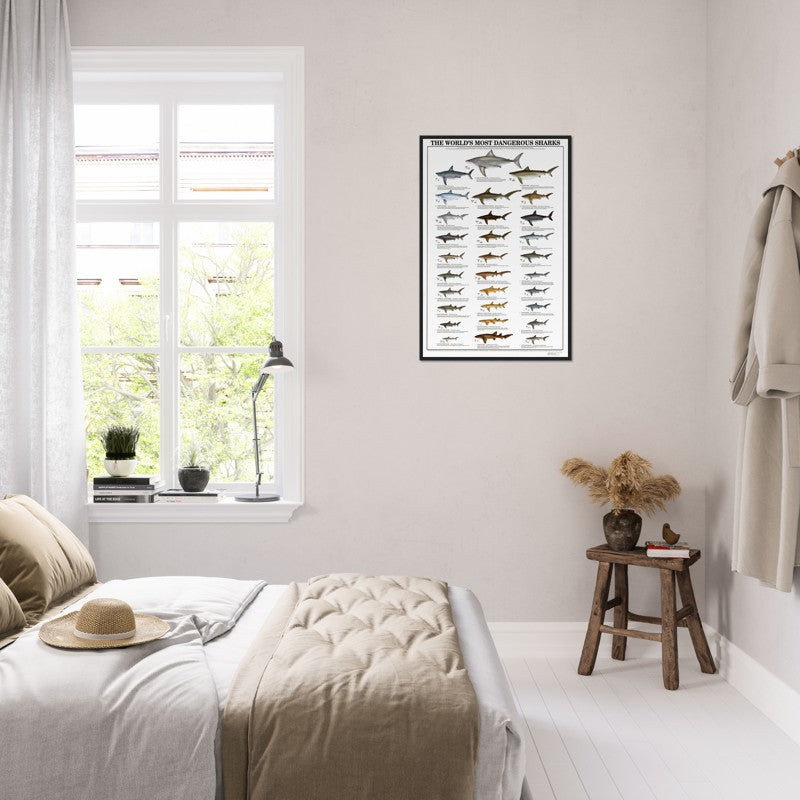 • Easy Shark identification. This Wall Art Chart features biologically exact illustrations of common species. Perfect for hanging in dorms, bedrooms, offices, or any blank walls that need some decoration.