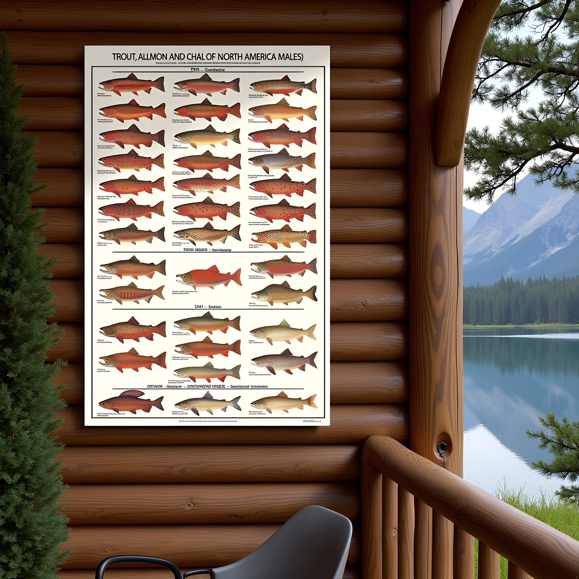 If you are a fishing enthusiast, then you'll love this Trout Salmon and Char Poster and Identification chart! This is not just a poster, but a great wall art print that adds an aesthetic appeal to any fishing cabin or room. The stunning design showcases different species of trout, salmon, and char.